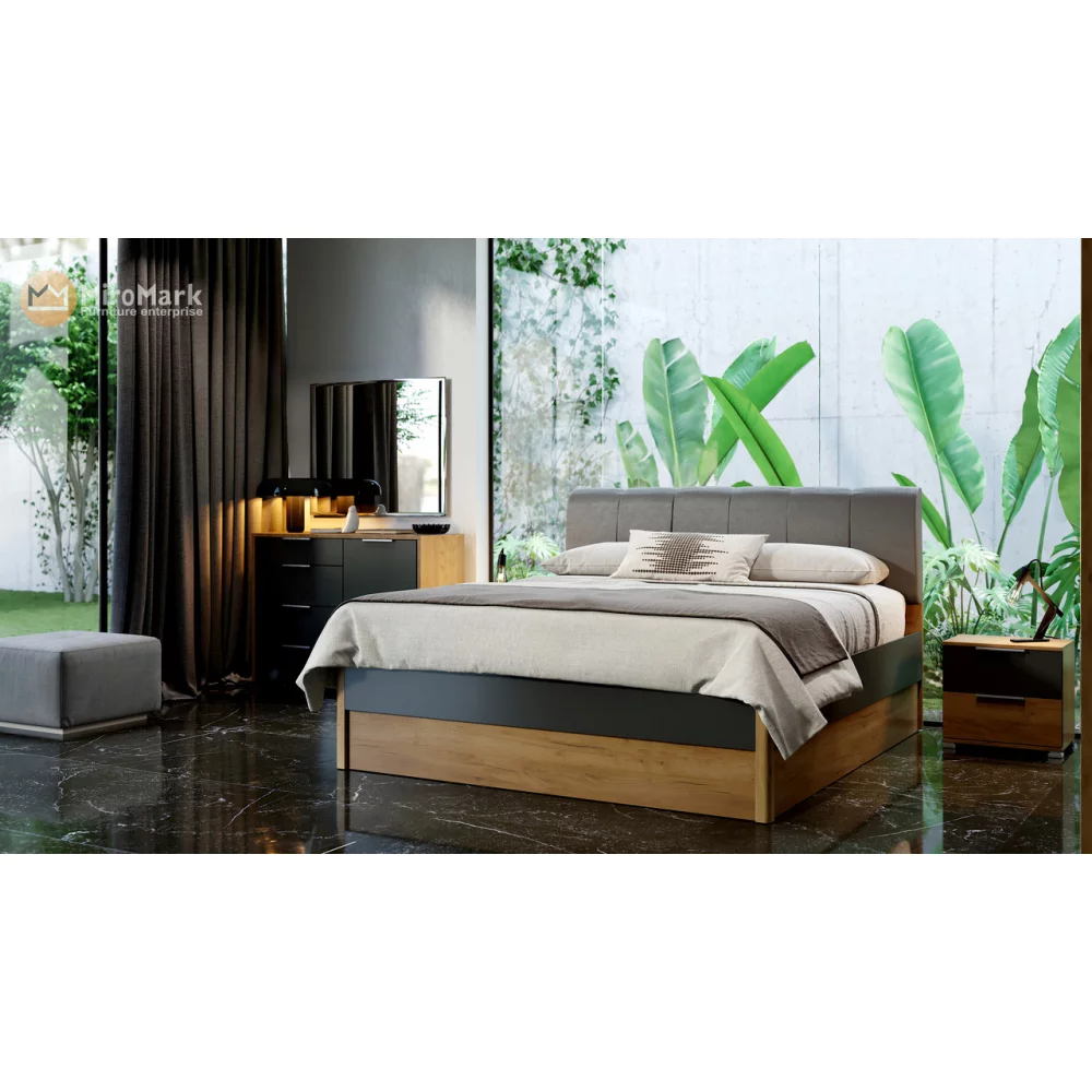 КроватьРамона изготавливается в современном стиле, что видно за счёт прямых форм, простоты в дизайне, комбинации оттенков дуб крафт со структурой дерева и черного матового лава. Двухспальная кровать от мебельной фабрики МироМарк. Корпус и фасады данной спальни изготовлены из ламинированной ДСП, Фасад: высокоглянцевые покрытие лакированное УФ лаками. Изголовье выполнено с мягкой обивкой.За счёт необычных оттенков черного матового и дуб крафт комната приобретает стильность и визуально ощущение комфорта и простора.