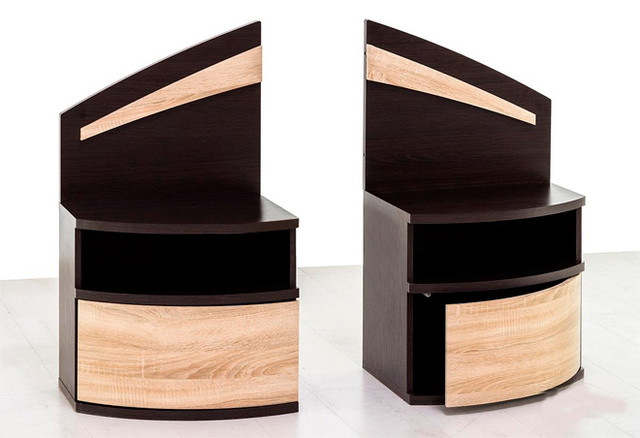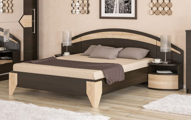 Спальня Аляска от Мебель-Сервис - с плавными линиями имеет ряд присущих только ей черт. Спальня Аляска может быть в светлых - дуб самоа или дуб молочный -  или в темном цвете - темный венге. Глянцевые вставки капуччино МДФ украшают фасады всех предметов из гарнитура Аляска и гармонично дополняют их. Особого внимания заслуживают округлые прикроватные тумбы и кровать. Они как будто являются одним целым, задние стенки прикроватных тумбочек являются продолжением изголовья кровати.